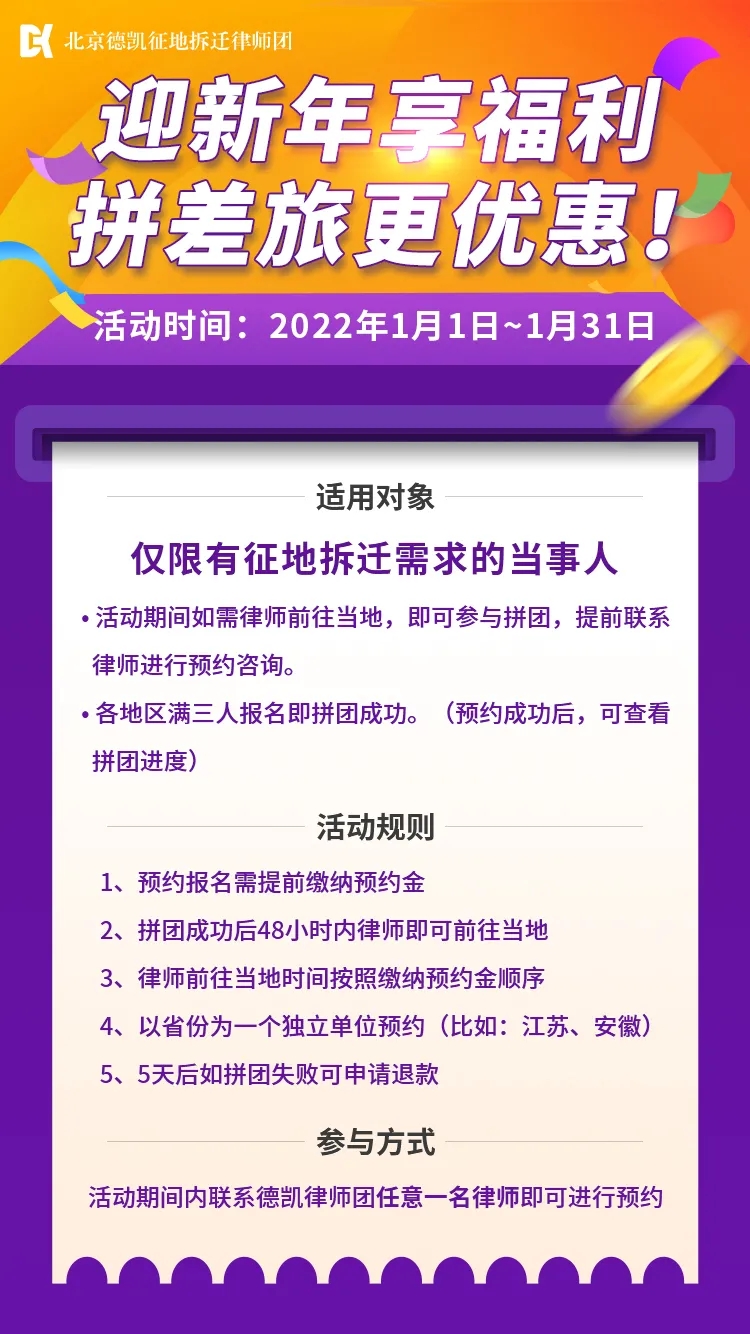 过去的一年,德凯律师团为上百位当事人争取到了合理补偿,为保证所有当事人的正常咨询与维权,也为了答谢大家长期以来对德凯律师团的支持,我们在年底特推出了“三人拼团,享年终钜惠”活动。