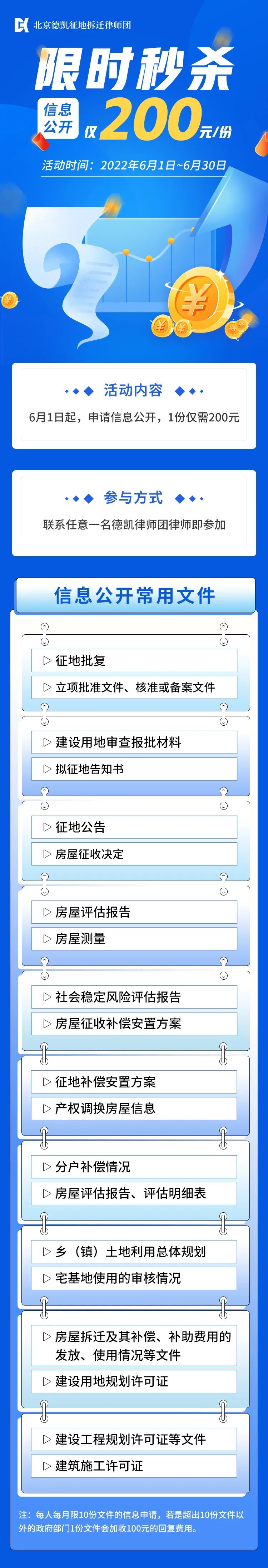 3、德凯律师团队始终坚信,只有当双方之间存在的信息差距足够小,被征收人的合法权益才能得到充分的保障。所以多年来德凯一直坚持通过线下全国普法公开课、线上直播、线上短视频、普法文章等多种途径进行公益普法,旨在更全面的普及拆迁知识。同时依靠多年信息公开处理的经验及完善的流程体系,以及大家长期对德凯律师团的支持,德凯律师团决定给予当事人信息公开申请上的扶持,回馈客户,让大家请得起律师,放心维权。