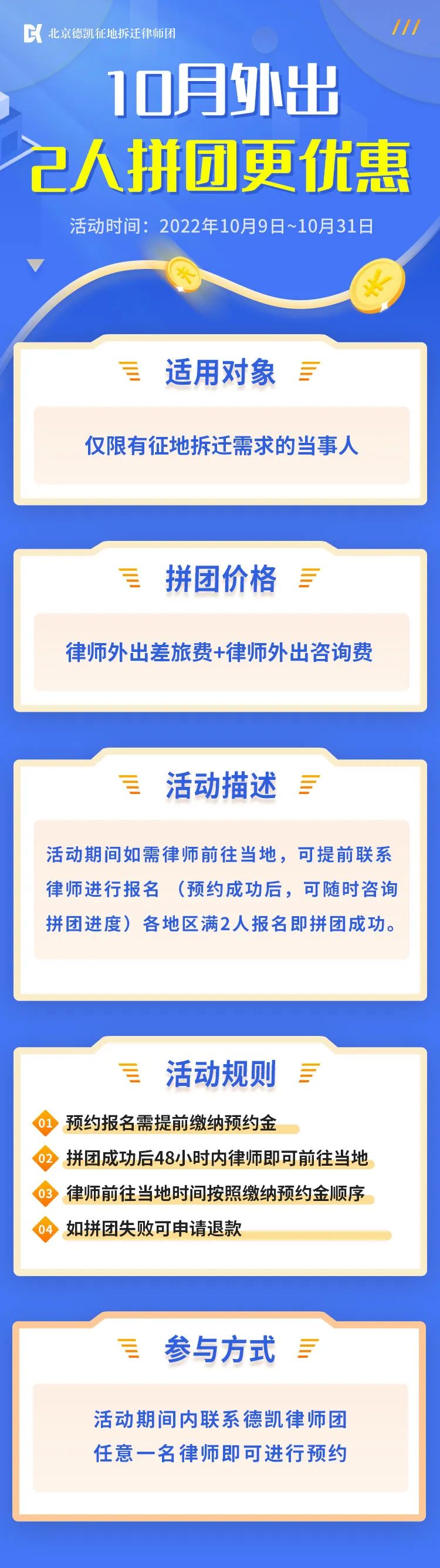 为了把真正的优惠给到大家,让大家请的起律师也能当面和律师沟通,德凯律师团本月特推出“10月外出,2人拼团更优惠”活动。