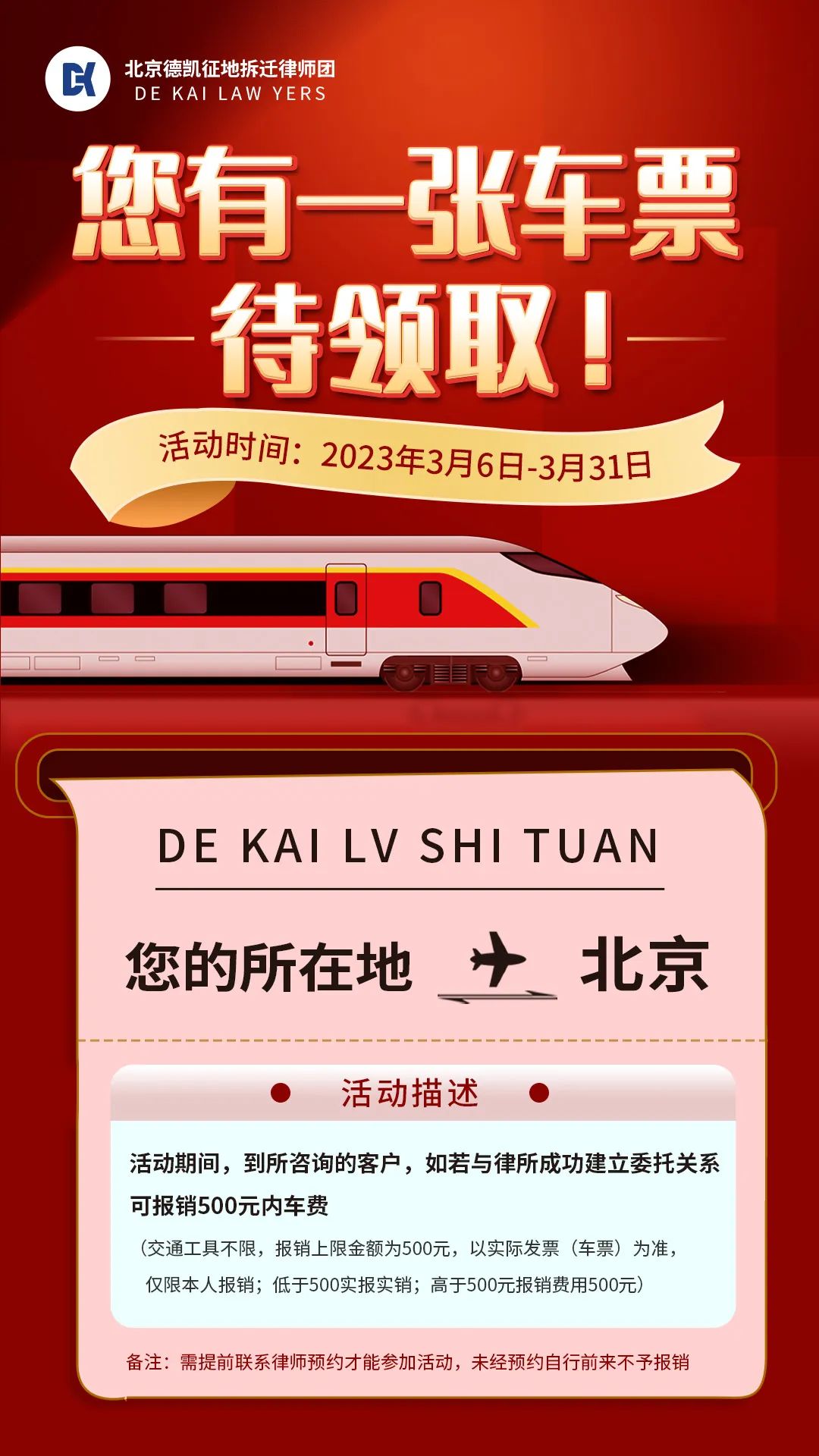为了感谢大家长期以来的支持,也希望能减少大家的维权成本,让大家能和律师面对面沟通,德凯律师团特推出此次差旅减免活动。活动期间,凡到所咨询的客户,如若与律所成功建立委托关系,可报销500元内车费。