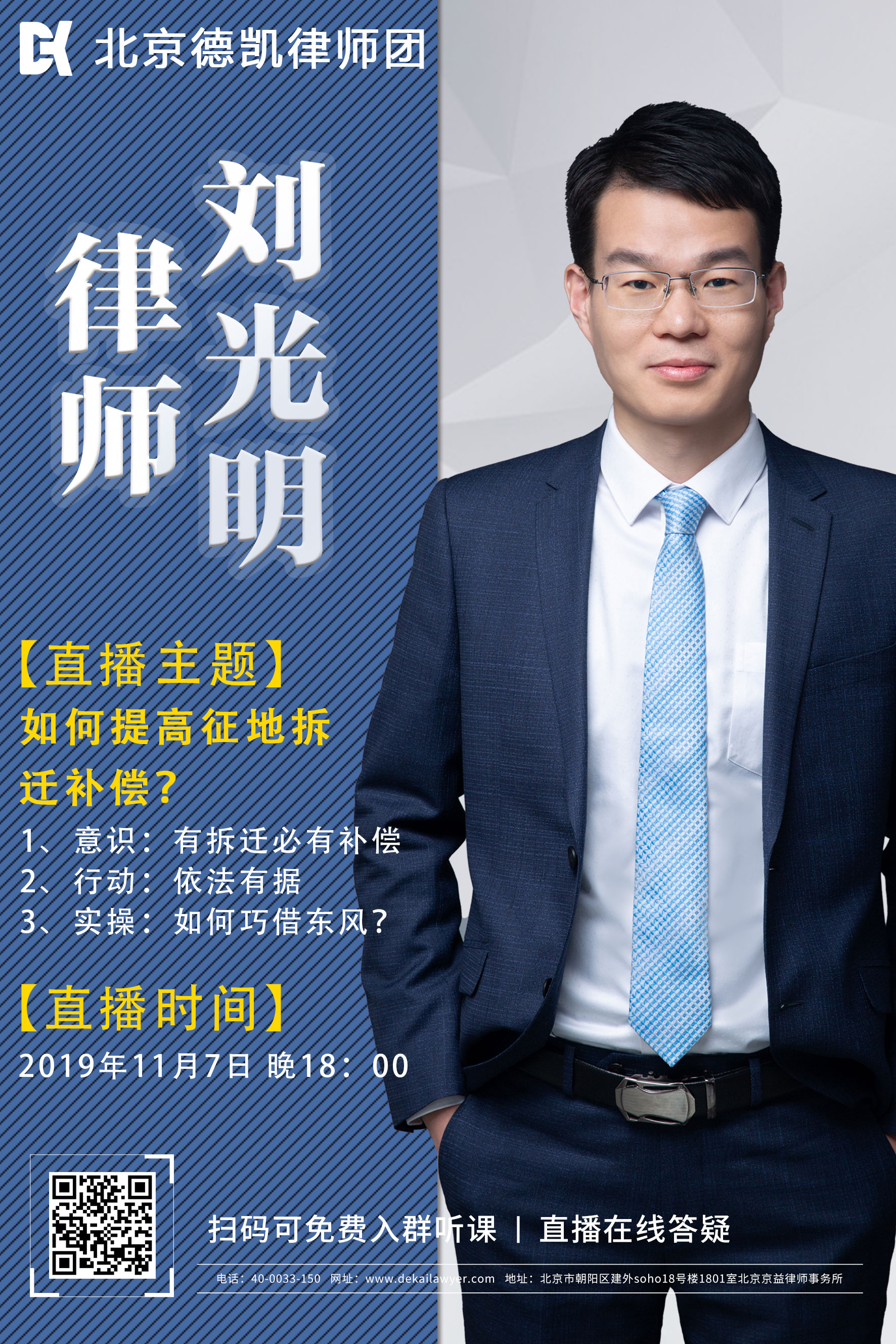 北京德凯律师团骨干律师/普法维权高级讲师刘光明律师将在11月7日晚18:00于【德凯征地拆迁全国经验交流群】内开展语音直播授课,以及实时语音解答!希望以我们的专业知识服务于广大被拆迁户们!