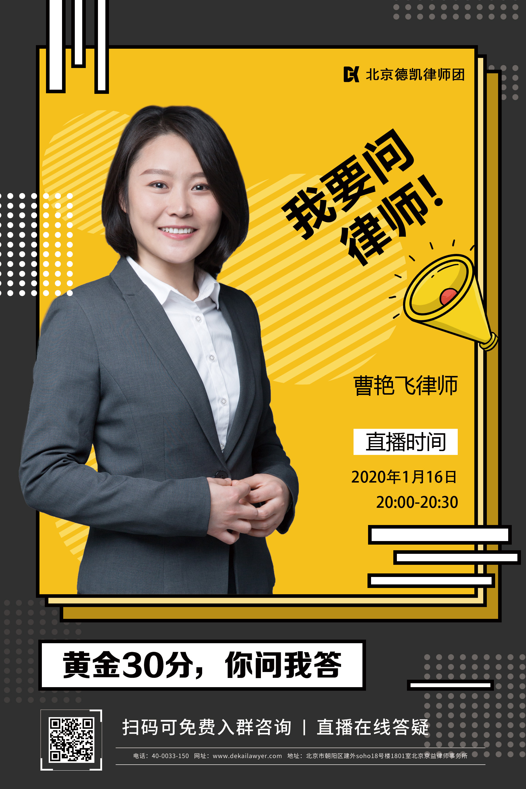 德凯律师团另外开设全新直播栏目《我要问律师!》黄金30分钟,全新的视频直播,即问即答!让专业的征地拆迁律师与你面对面。