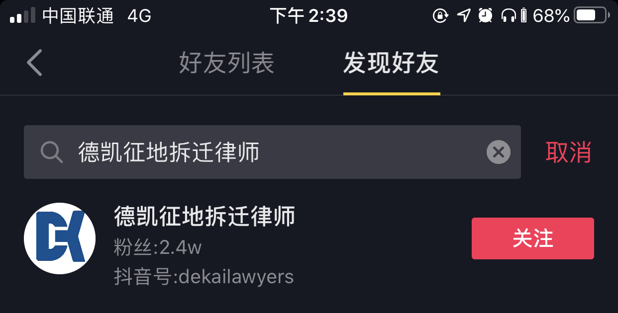 Step2: 搜索用户“德凯征地拆迁律师”或抖音号“dekailawyers”