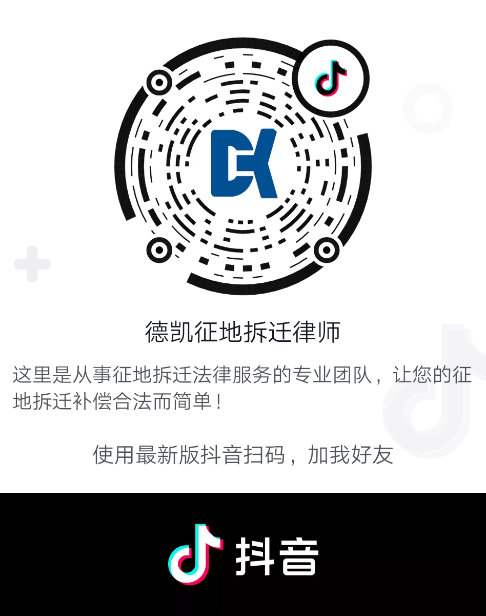 Step2: 保存下方图片到相册,打开抖音即可进入“德凯征地拆迁律师”抖音号,点击关注