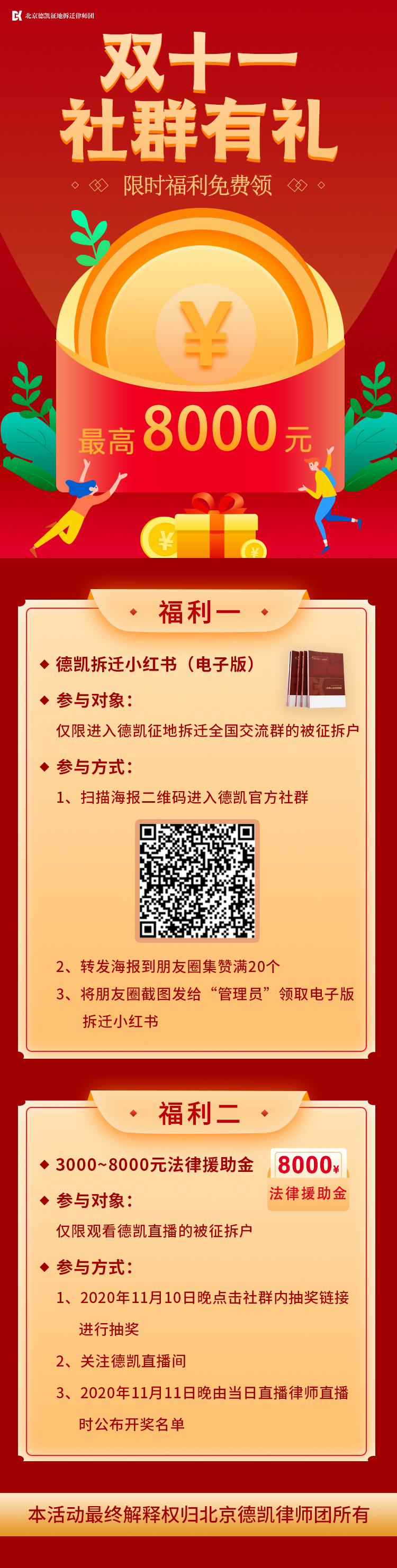 2、福利二开奖时间为2020年11月11日20:30,由当日主讲律师在德凯律师团直播间内手动开奖。