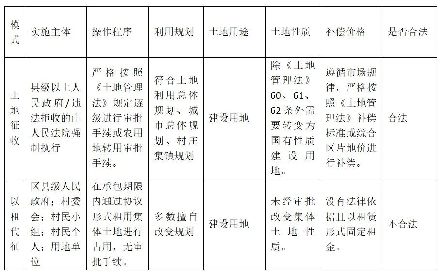 律师给广大朋友通过表格的形式对“以租代征”和“土地征收”进行比较,让大家比较直观的对两种模式有一个清晰的认识。
