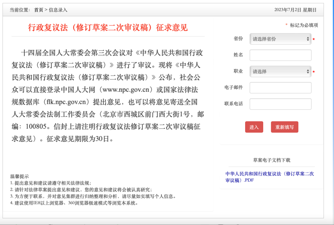 行政复议法修订草案六月二十七日再次提请十四届全国人大常委会第三次会议审议。修订草案二审稿较此前的草案相比,进一步完善了立法目的,增加“推进法治政府建设”的内容,并在行政复议机关履职的原则中完整体现“公正高效、便民为民”的要求。同时,修订草案二审稿在此前的基础上又有添加。