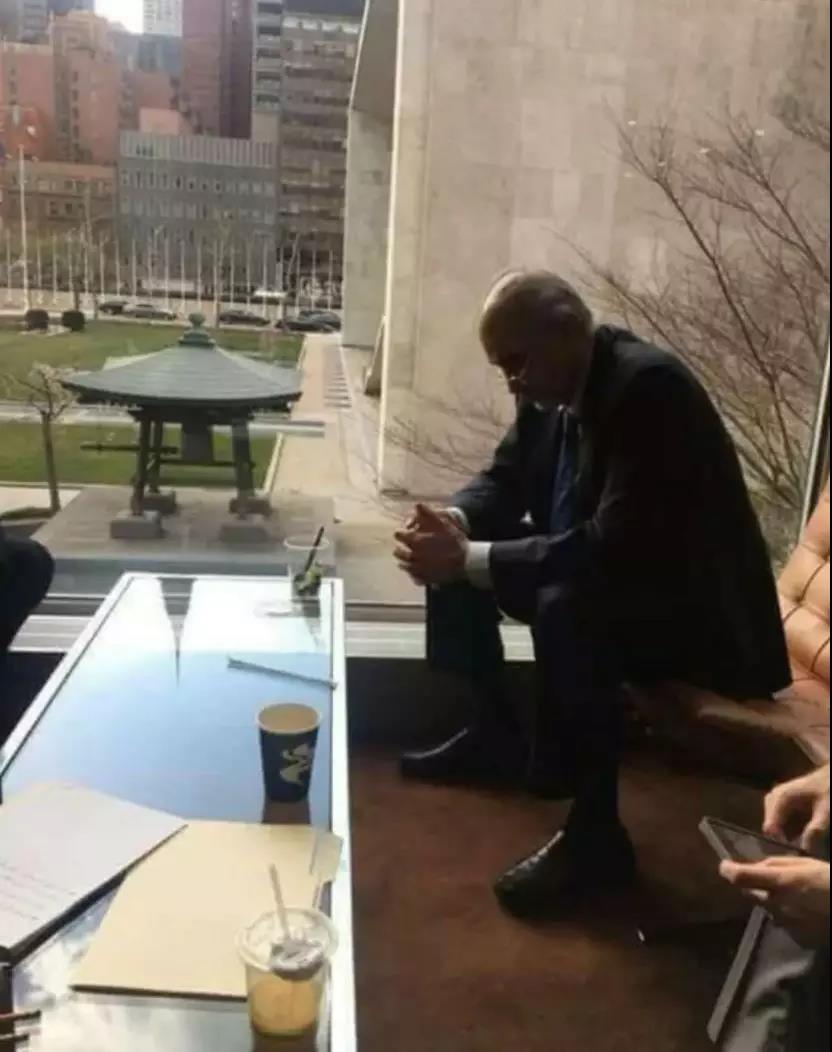 此时,叙利亚驻联合国代表贾法里垂着头,坐在会场外。