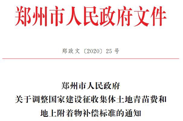发布时间:2020-03-20 20:59保障国家建设用地的需求,维护农民的合法权益,2020年2月25日,郑州市政府印发了《郑州市人民政府关于调整国家建设征收集体土地青苗费和地上附着物补偿标准的通知》(郑政文〔2020〕25号,以下简称《通知》)。通知称,结合郑州市物价变动情况,经市政府研究决定,调整郑州市征收集体土地青苗费和地上附着物补偿标准。