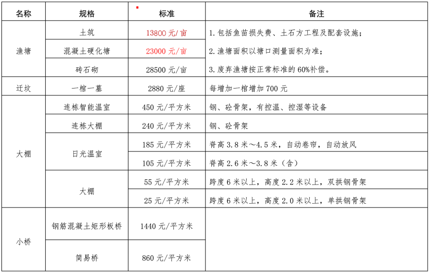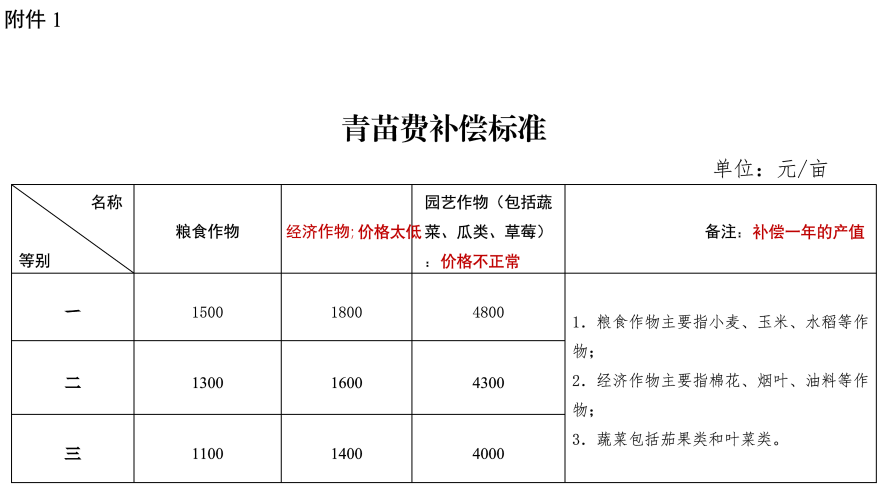 (一)青苗费补偿标准。主要是对不同等别的粮食作物、经济作物、园艺作物等的补偿标准进行明确。