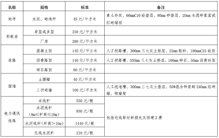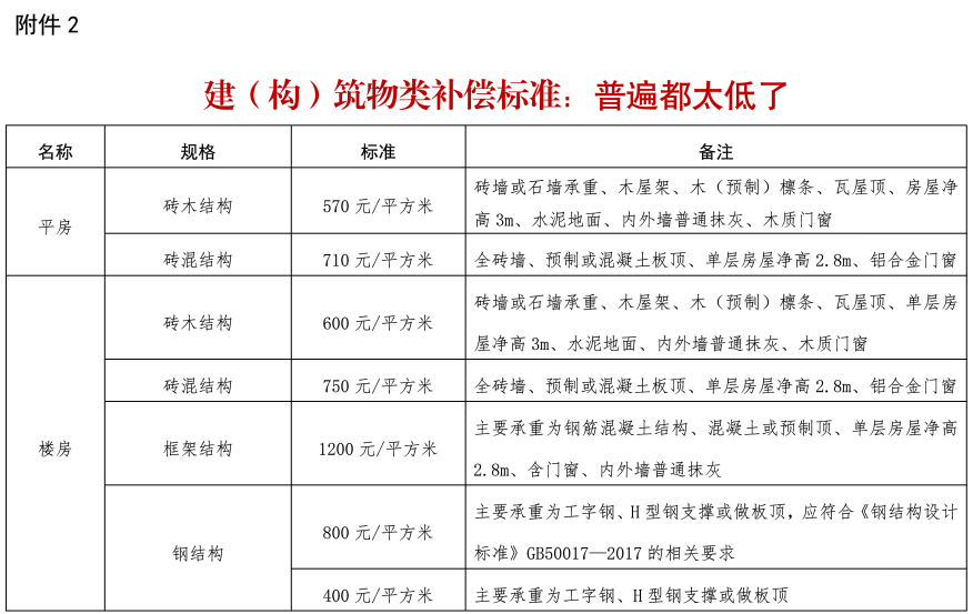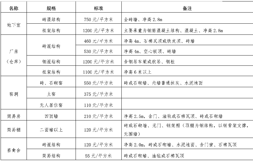 (二)建(构)筑物类补偿标准。主要是对不同规格的平房、楼房、地下室、厂房(仓库)等60个具体补偿标准进行明确。