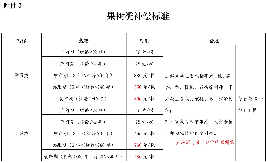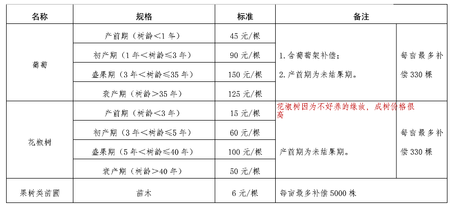 (三)果树类补偿标准。主要是对不同规格的鲜果类、干果类、葡萄、花椒树、果树类苗圃等19个具体补偿标准进行明确。