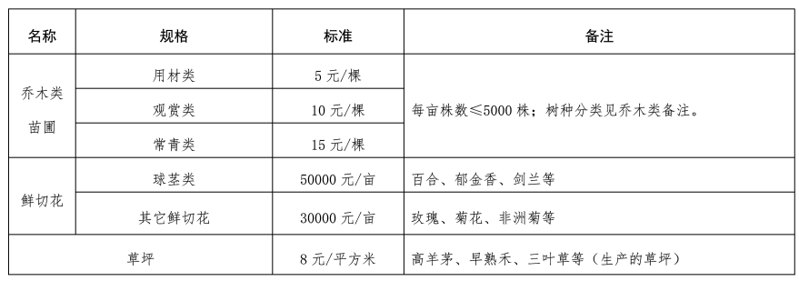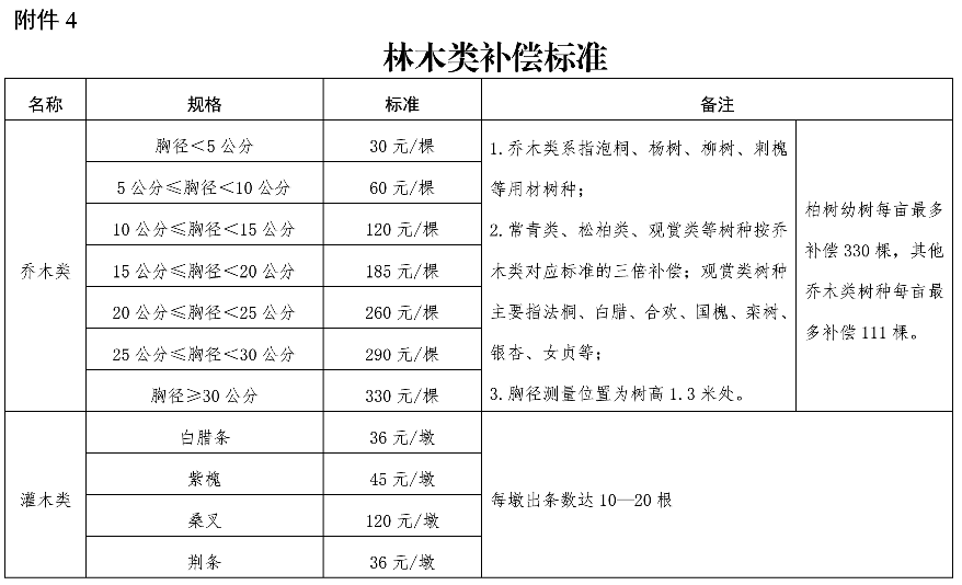 (四)林木类补偿标准。主要是对不同规格的乔木类、灌木类、乔木类苗圃、鲜切花、草坪等17个具体补偿标准进行明确。