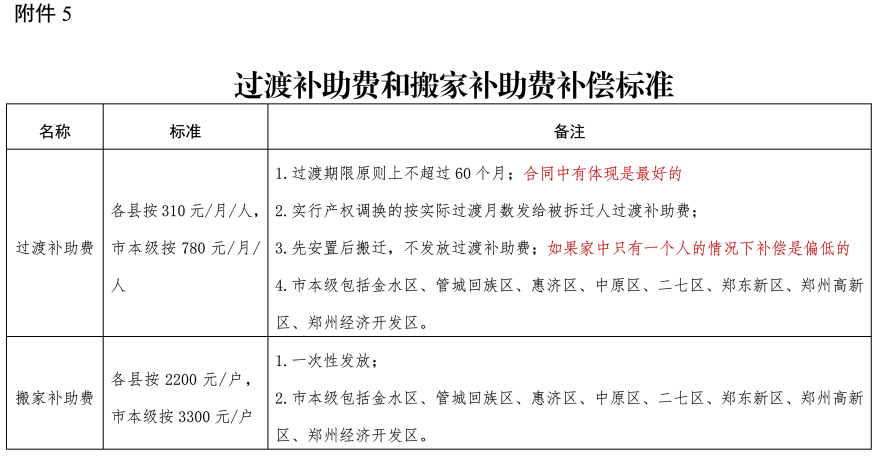 (五)过渡补助费和搬家补助费补偿标准。主要是按各县、市本级将过渡补助费和搬家补助费的补偿标准进行明确。
