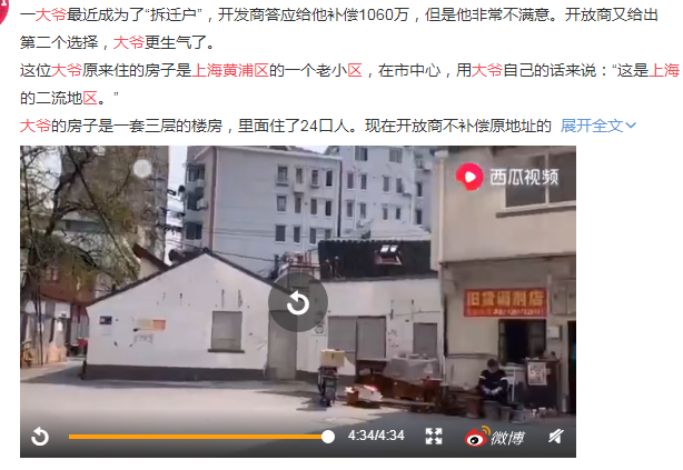 每每遇到拆迁的时候,听到拆迁户说的最多的就是补偿不合理,要么是给的钱太少,要么是给的安置房太小。下面我们来看一则微博上的故事: