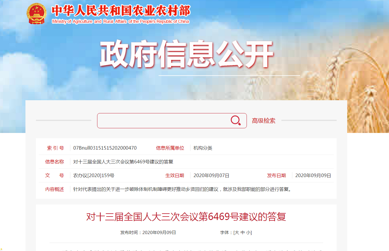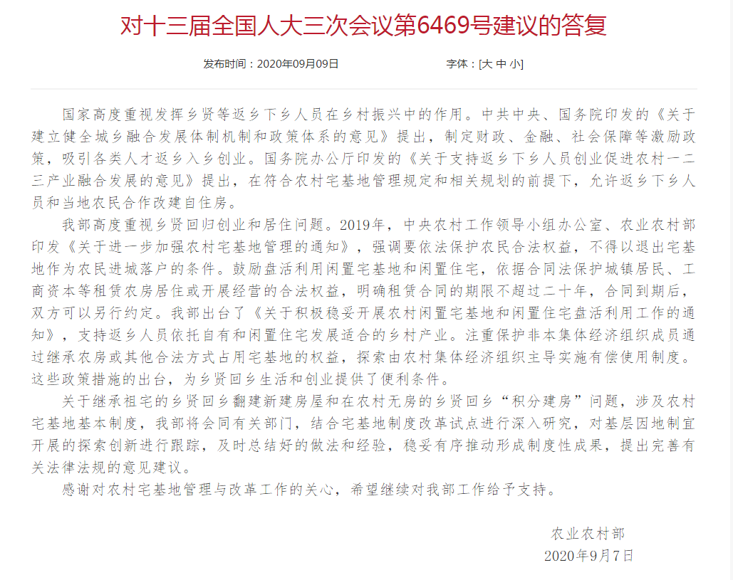 据农业农村部网站9月9日消息,农业农村部发布对十三届全国人大三次会议第6469号建议的答复。针对代表提出的关于进一步破除体制机制障碍更好推动乡贤回归的建议,国家高度重视发挥乡贤等返乡下乡人员在乡村振兴中的作用。中共中央、国务院印发的《关于建立健全城乡融合发展体制机制和政策体系的意见》提出,制定财政、金融、社会保障等激励政策,吸引各类人才返乡入乡创业。国务院办公厅印发的《关于支持返乡下乡人员创业促进农村一二三产业融合发展的意见》提出,在符合农村宅基地管理规定和相关规划的前提下,允许返乡下乡人员和当地农民合作改建自住房。