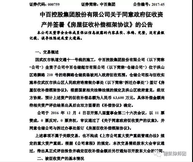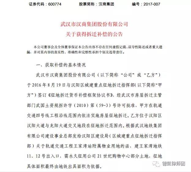 汉商集团(乙方)于2016年8月19日与汉阳区城建重点征地拆迁指挥部(甲方)签订《征地拆迁货币补偿框架协议书》,甲方在轨道交通四号线工程沿线范围内依法实施房屋征地拆迁。