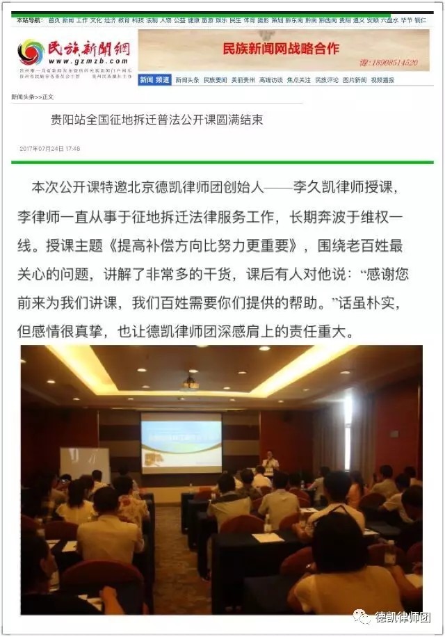 2017年7月22日下午1点,一个激动人心的时刻,北京德凯征地拆迁律师团——全国征地拆迁普法公开课(贵阳站),在贵阳林城万宜酒店举办,来自贵州贵阳、安顺、都匀、六盘水、铜仁、遵义,四川内江、成都,重庆,浙江台州,云南昆明等地20多个征地拆迁项目50多名征地拆迁户,共同聆听了这场别开生面的公益普法课。