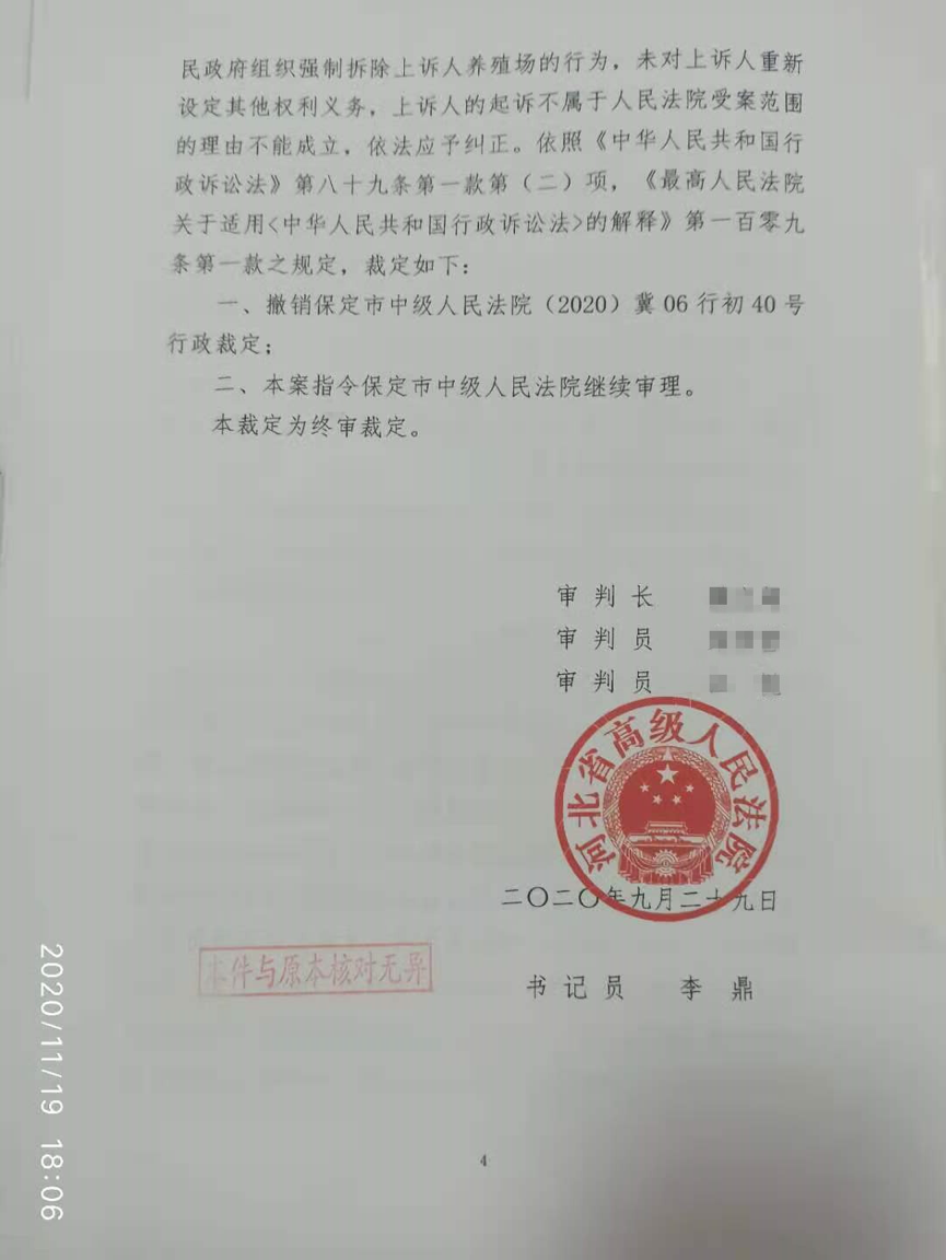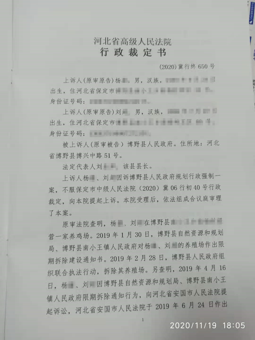 杨婷婷律师、关舸律师认为博野县人民政府在已经撤销了限期拆除通知书后,仍对于养殖场进行拆除,系违法强拆。拆除行为过后立即搜集证据,准备诉讼工作。在一审驳回起诉后,上诉到二审法院,最终获得了二审法院的支持。