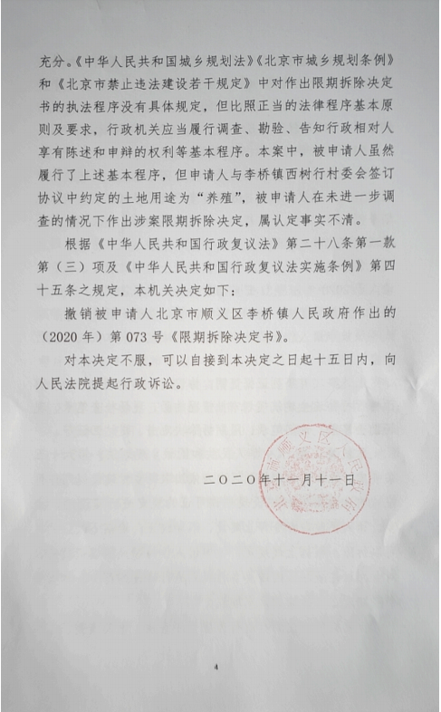 撤销被申请人北京市顺义区李桥镇人民政府作出的(2020年)第073号《限期拆除决定书》。