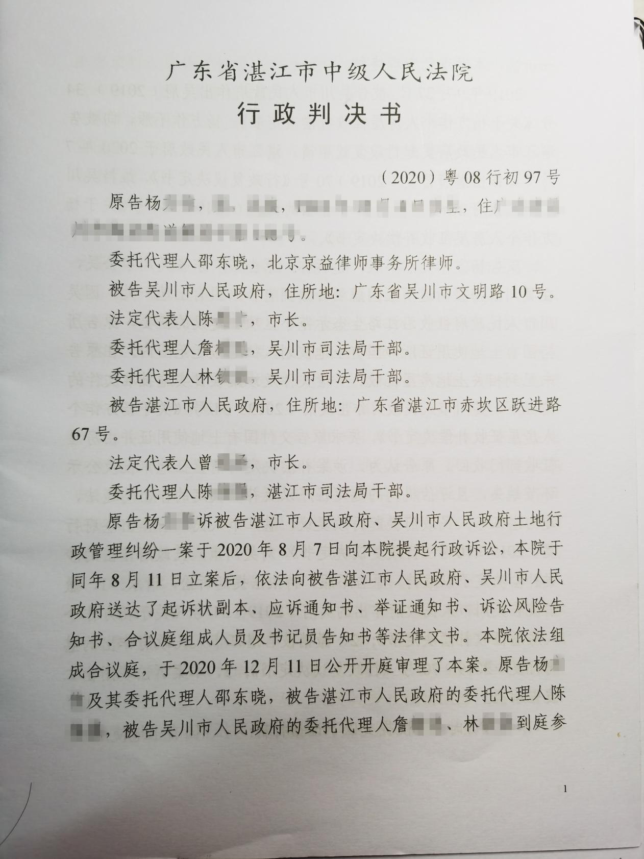 杨某系吴川市人,在当地有一处合法国有土地,因吴川市政府征收沿江路生态示范小区项目建设的需要,杨某的国有土地被划入征地搬迁范围内。在杨某未见到相关土地房屋征收、补偿文件及涉案项目实施批准文件的情况下,吴川市政府作出《房屋征收补偿决定书》。杨某收到后自行提起了行政复议,在复议机关维持原行为后,委托北京德凯律师团介入维权,提高补偿。