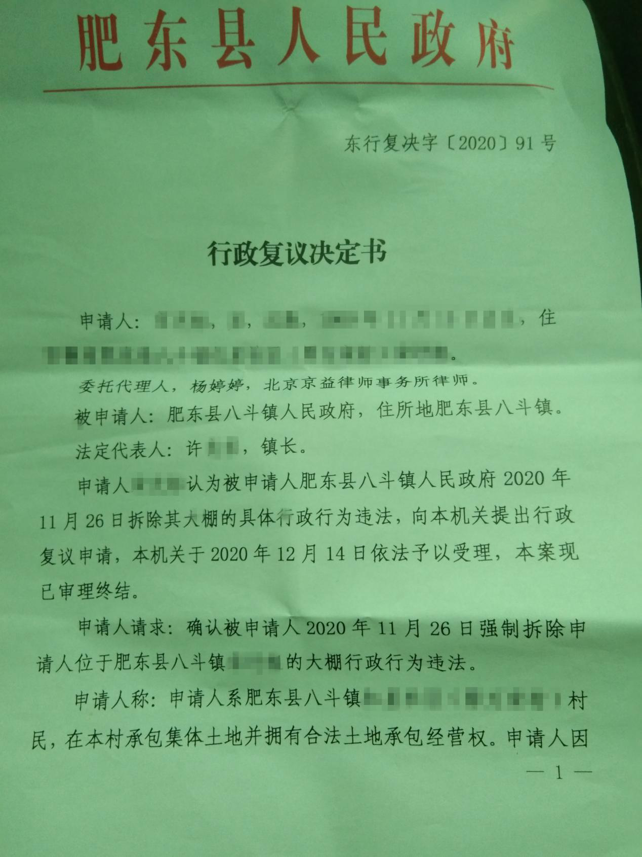 我们认为行政机关具体行政行为对自身权益造成侵害时,可以在60天内提起行政复议或者6个月内提起行政诉讼维护自身合法权益,这是法律赋予我们的权利。本案中镇政府在认定违建及强制拆除大棚时并未告知相关救济权利和救济时间,在当天就实施了强制拆除行为。基于此我们才可以通过行政复议程序确认对方行为违法,为之后申请行政赔偿工作打下坚实的基础。如果您也在地方追求指标时,导致自家财产受到了影响,一定要及时咨询专业的律师,听取法律意见后,作出正确的选择。