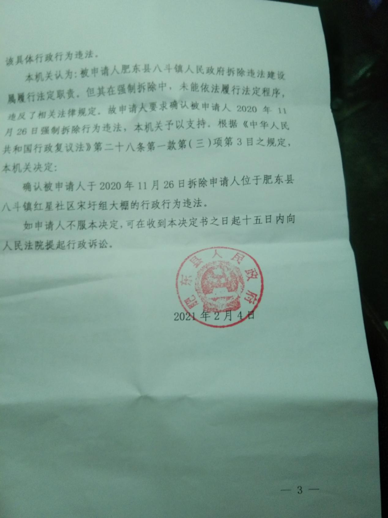 德凯律师团接受委托后,指派杨婷婷律师协助宋某开展法律工作。杨婷婷律师分析过后,认为镇政府在未下发任何法律文书的前提下,组织人员机械对申请人的大棚实施强制拆除,违反法律规定,提起行政复议工作确认镇政府强制拆除行为违法。