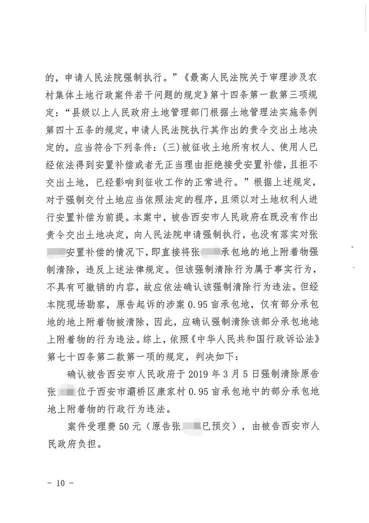 确认被告于2019年3月5日强制清除原告位于西安市灞桥区康家村0.95亩承包地中的部分承包地地上附着物的行政行为违法。