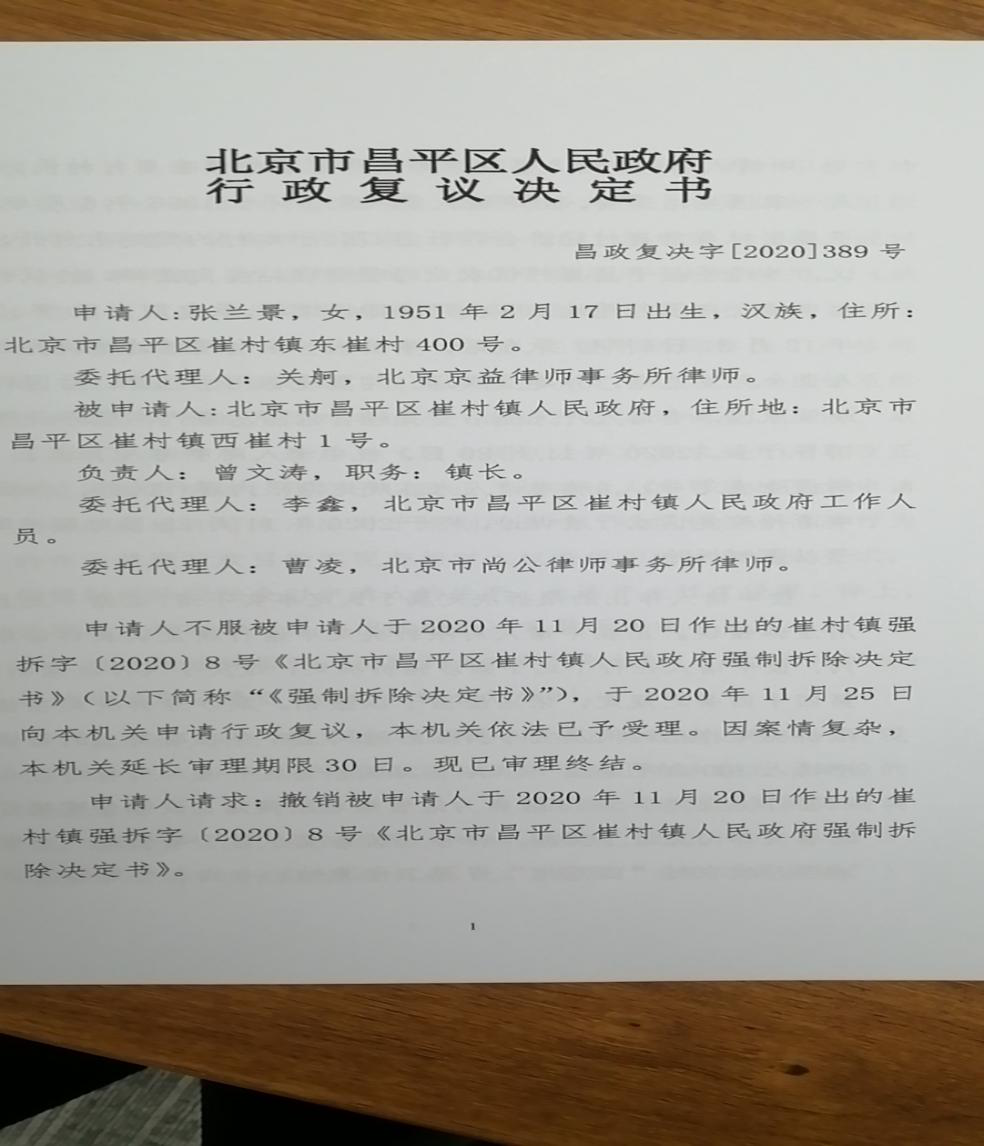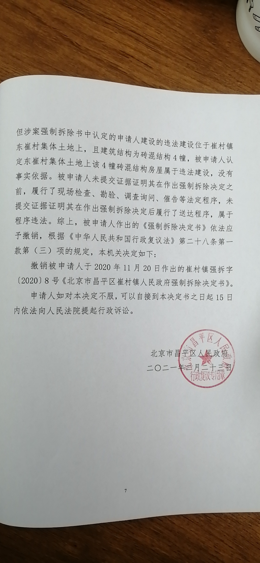请求撤销北京市昌平区崔村镇人民政府作出的《强制拆除决定书》