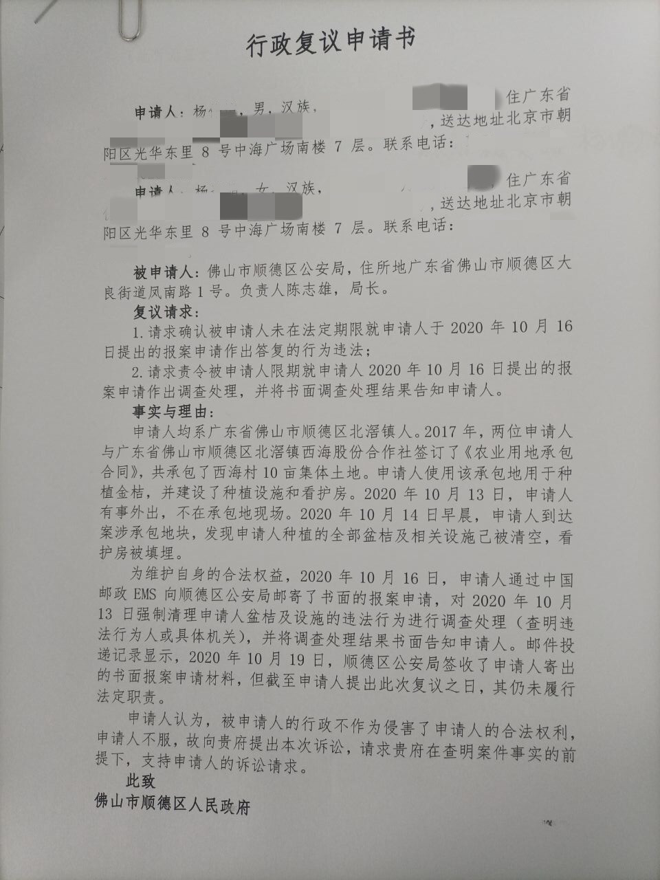 杨某和杨某某是广东省佛山市人。2017年,两位当事人与广东省佛山市某股份合作社签订了《农业用地承包合同》,共承包了某村10亩集体土地。当事人使用该承包地用于种植金桔,并建设了种植设施和看护房。2020年10月13日,申请人有事外出,不在承包地现场。2020年10月14日早晨,申请人到达该承包地块,发现申请人种植的全部盆桔及相关设施已被清空,看护房被填埋。