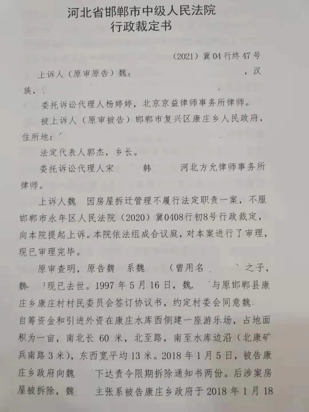 1997年5月16日,魏某父亲与原邯郸县康庄乡康庄村村民委员会签订协议书,约定村委会同意魏某父亲自筹资金和引进外资在康庄水库西侧建一座游乐场,占地面积一亩。2018年1月5日,乡政府向魏某父亲下达责令限期拆除通知书两份,后来此房屋被拆除。魏某父亲主张乡政府于2018年1月18日对该房屋实施的强制拆除行为违法,向邯郸市复兴区人民法院提起了行政诉讼。本案件后经邯郸市中级人民法院指令邯郸市永年区人民法院审理,在此期间,魏某父亲病故,由魏某继续行使相关诉权。永年区人民法院审理后,认为魏某提供的证据不足以证实是乡政府实施了强制拆除其游乐园房屋的行政行为,驳回了魏某的起诉。