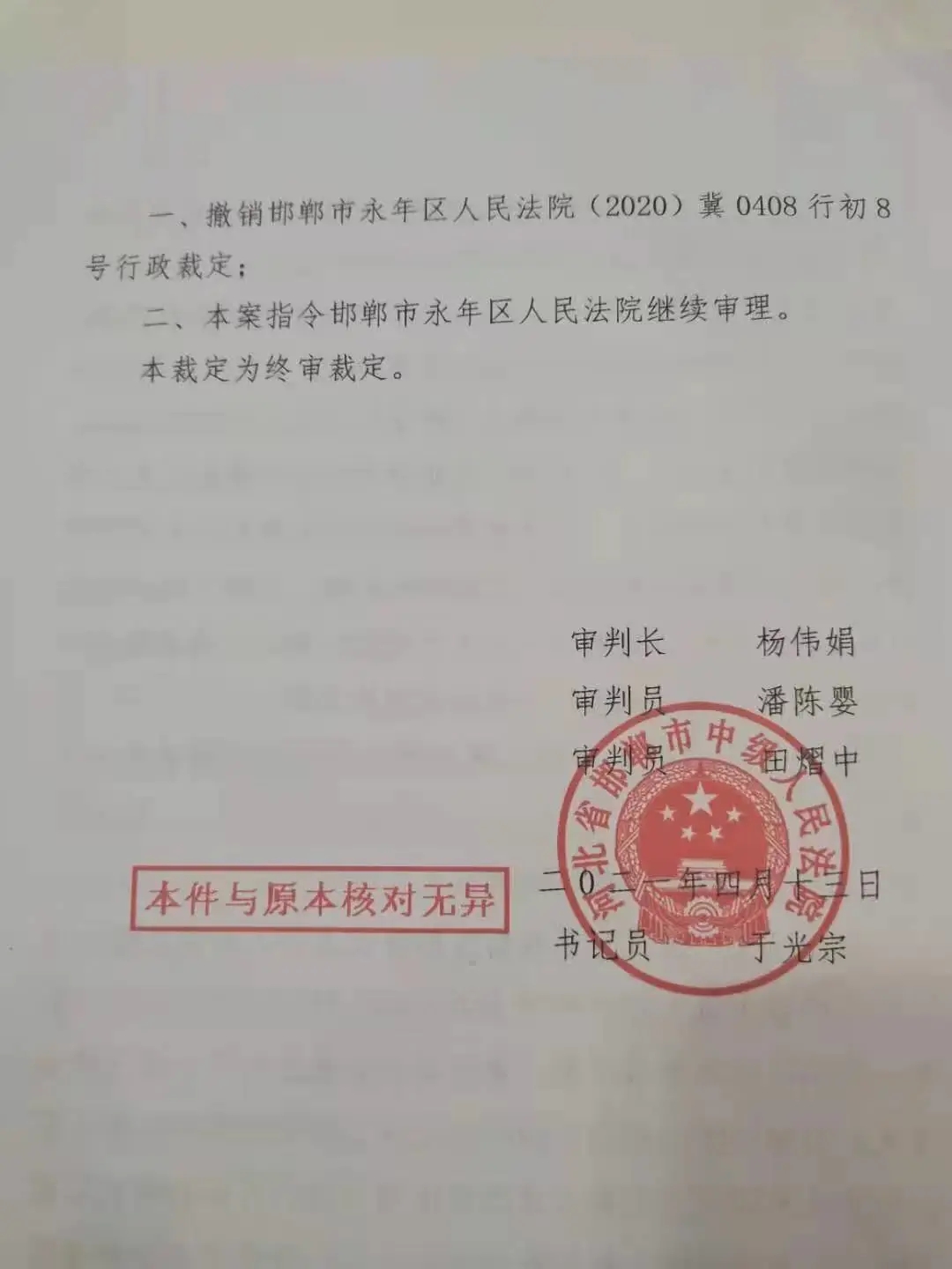 撤销邯郸市永年区人民法院(2020)冀0408行初8号行政裁定,指令邯郸市永年区人民法院继续审理