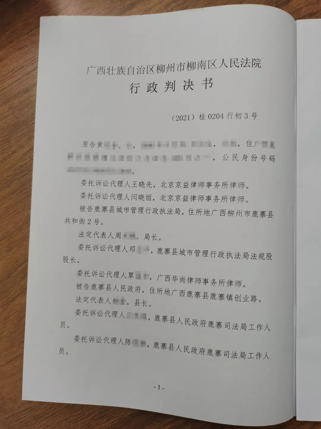 黄某系广西鹿寨县鹿寨镇人,在此地建有宅基地房屋共家人居住生活。2020年3月,因鹿寨县大小龙田屯整村改造项目的建设,黄某宅基地房屋被划入拆迁范围内。2020年8月24日被告一做出了《处罚决定书》,认定黄某宅基地房屋及附属设施属违法建设,要求黄某自行拆除。随后,黄某向被告二申请行政复议,但被告二维持了《处罚决定书》。黄某为维护自身合法权益,委托北京京益律师事务所开展维权法律工作。