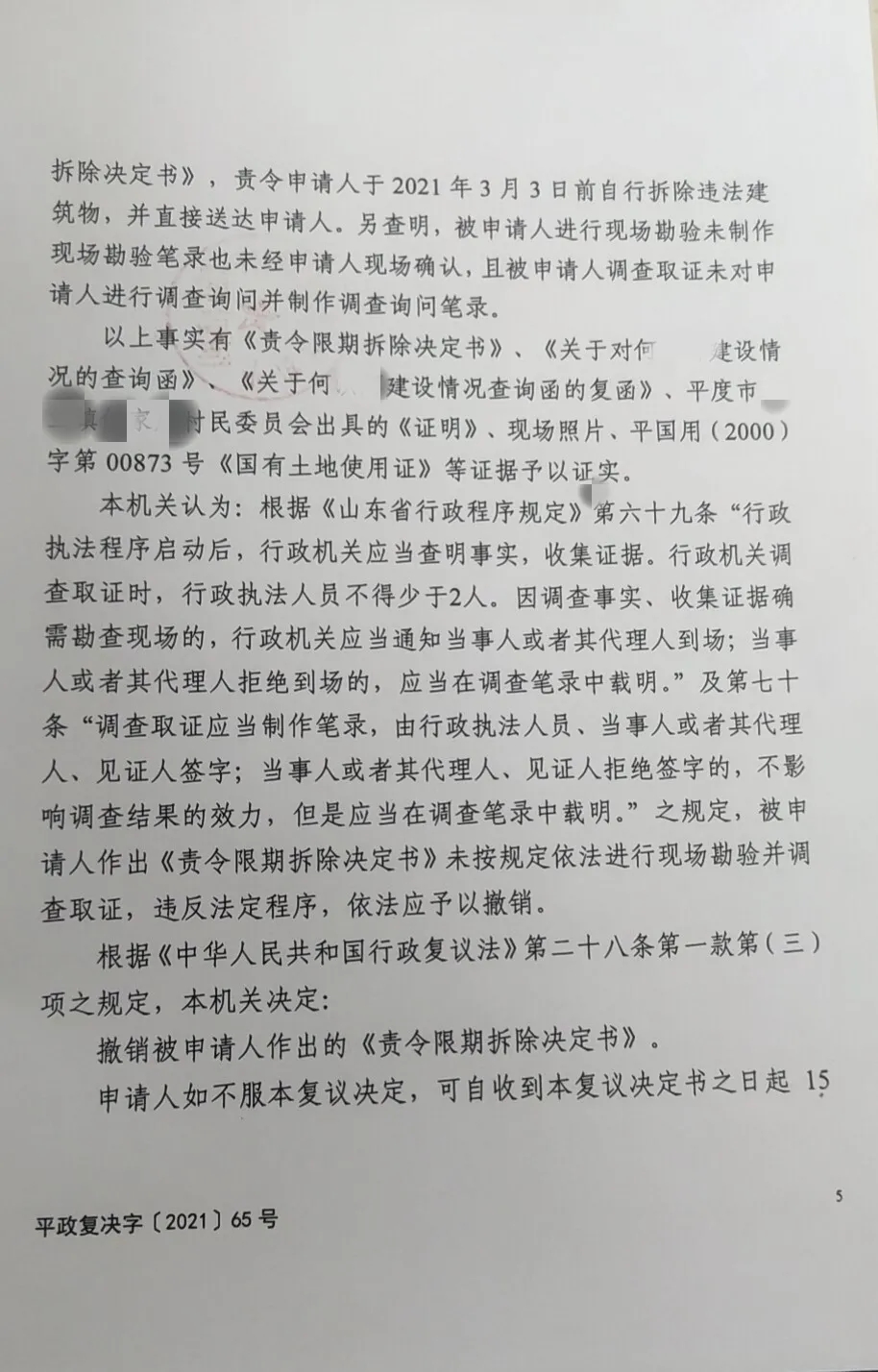 复议机关认为,根据《山东省行政程序规定》第六十九条“行政执法程序启动后,行政机关应当查明事实,收集证据。行政机关调查取证时,行政执法人员不得少于2人。因调查事实、收集证据确需勘查现场的,行政机关应当通知当事人或者其代理人到场;当事人或者其代理人拒绝到场的,应当在调查笔录中载明。”及第七十条“调查取证应当制作笔录,由行政执法人员、当事人或者代理人、见证人签字;当事人或者其代理人、见证人拒绝签字的,不影响调查结果的效力,但是应当在调查笔录中载明。”之规定,被申请人作出《责令限期拆除决定书》未按规定依法进行现场勘验并调查取证,违反法定程序,依法应予撤销。