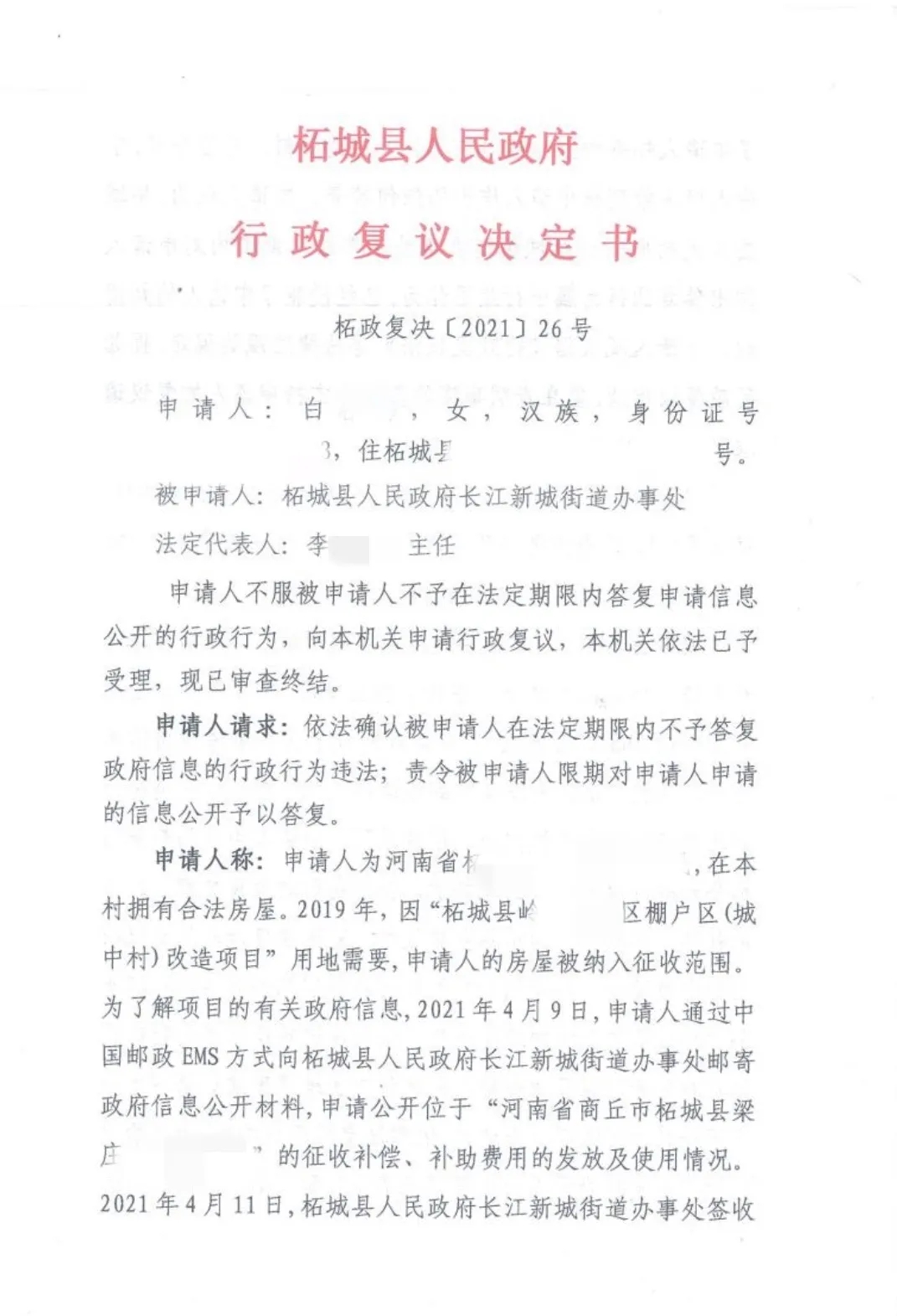 白某某是拓城县岭子杨村村民,在本村拥有合法住房。2019年因棚户区改造项目用地需要,将白某某的房屋纳入征收范围。为了了解拆迁相关信息,当事人委托了北京京益律师事务所办理政府信息公开工作,但被申请人至今没有依法做出信息公开。