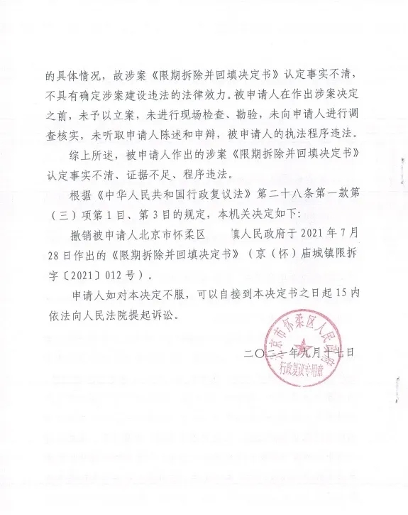 撤销镇政府于2021年7月28日作出的《限期拆除并回填决定书》。