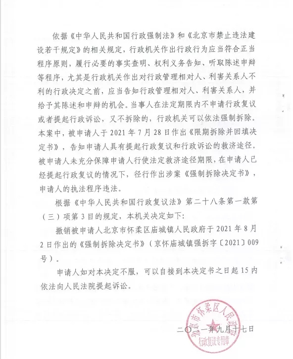 北京德凯律师团接受委托后,遂指派陈亮律师协助褚某开展法律工作。在律师阅卷后认为,镇政府所作出的限拆决定后,未给予当事人合理期限进行权利救济,且褚某已就限拆决定申请了行政复议,在复议期间内就径自作出强拆决定的行为明显违反了《行政强制法》的规定。存在认定事实不清,证据不足,前置程序缺失等错误。针对于强拆决定应当通过行政复议程序进行撤销。