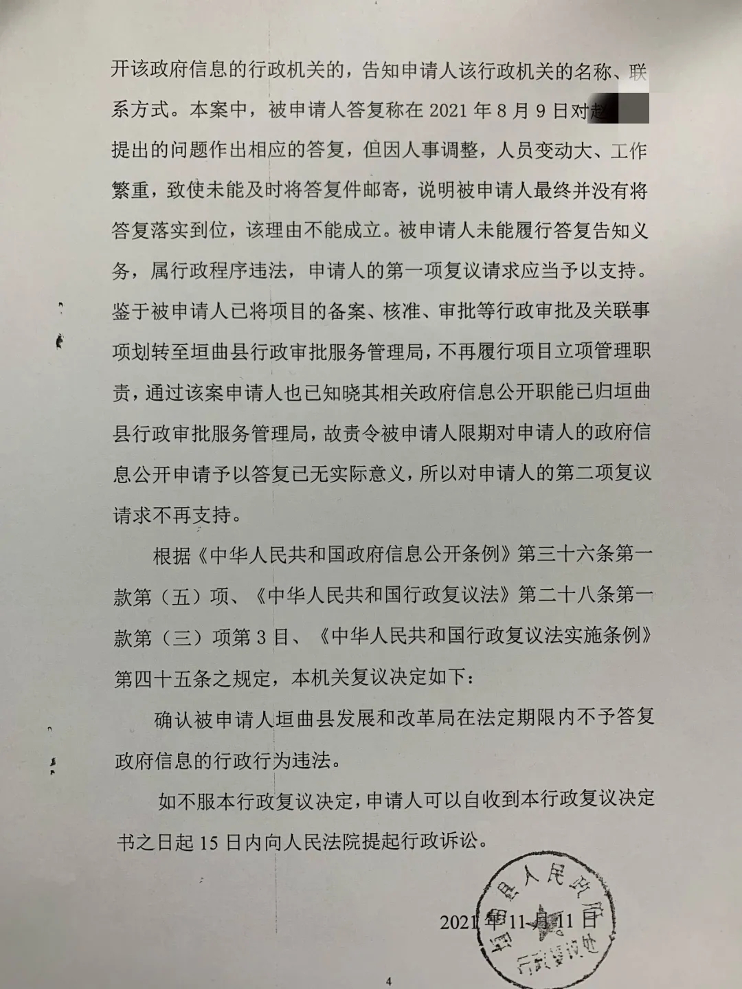 被申请人至今未对信息公开依法做出答复,已经超过法定时限,属于违法行为。同时被告辩称,被申请人在申请人提起政府信息公开申请之前已将项目的备案、核准、审批等行政审批及关联事项划转至垣曲县行政审批服务管理局,不再履行项目立项管理职责。
