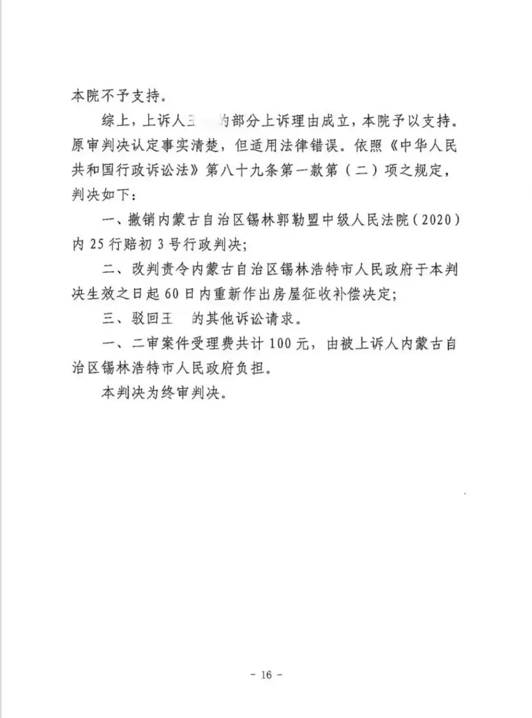 撤销一审判决;改判责令锡林浩特市政府于60日内重新作出房屋征收与补偿决定。