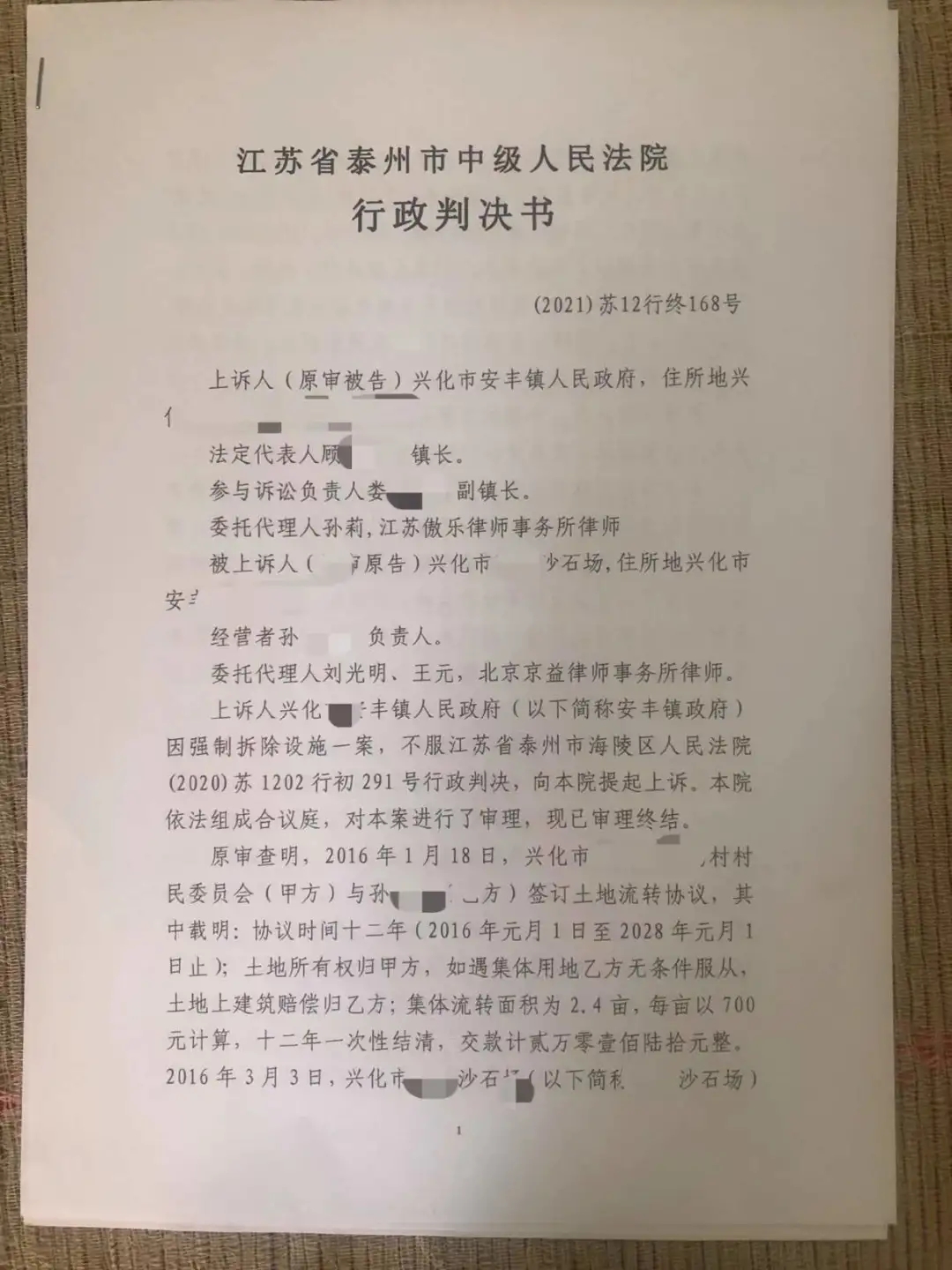 江苏省泰州市海陵区人民法院(2020)苏1202行初291号行政判决,确认安丰镇政府实施的强制拆除XX沙石场码头及附属设施的行为违法。兴化市安丰镇人民政府不服,提起上诉。