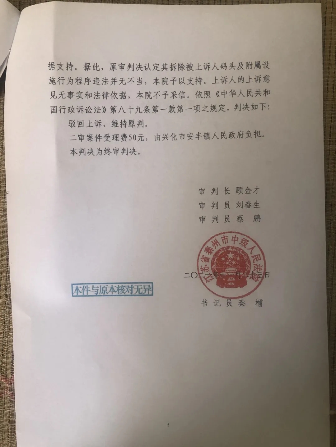 (二)二审案件受理费50元,由兴化市安丰镇人民政府负担。