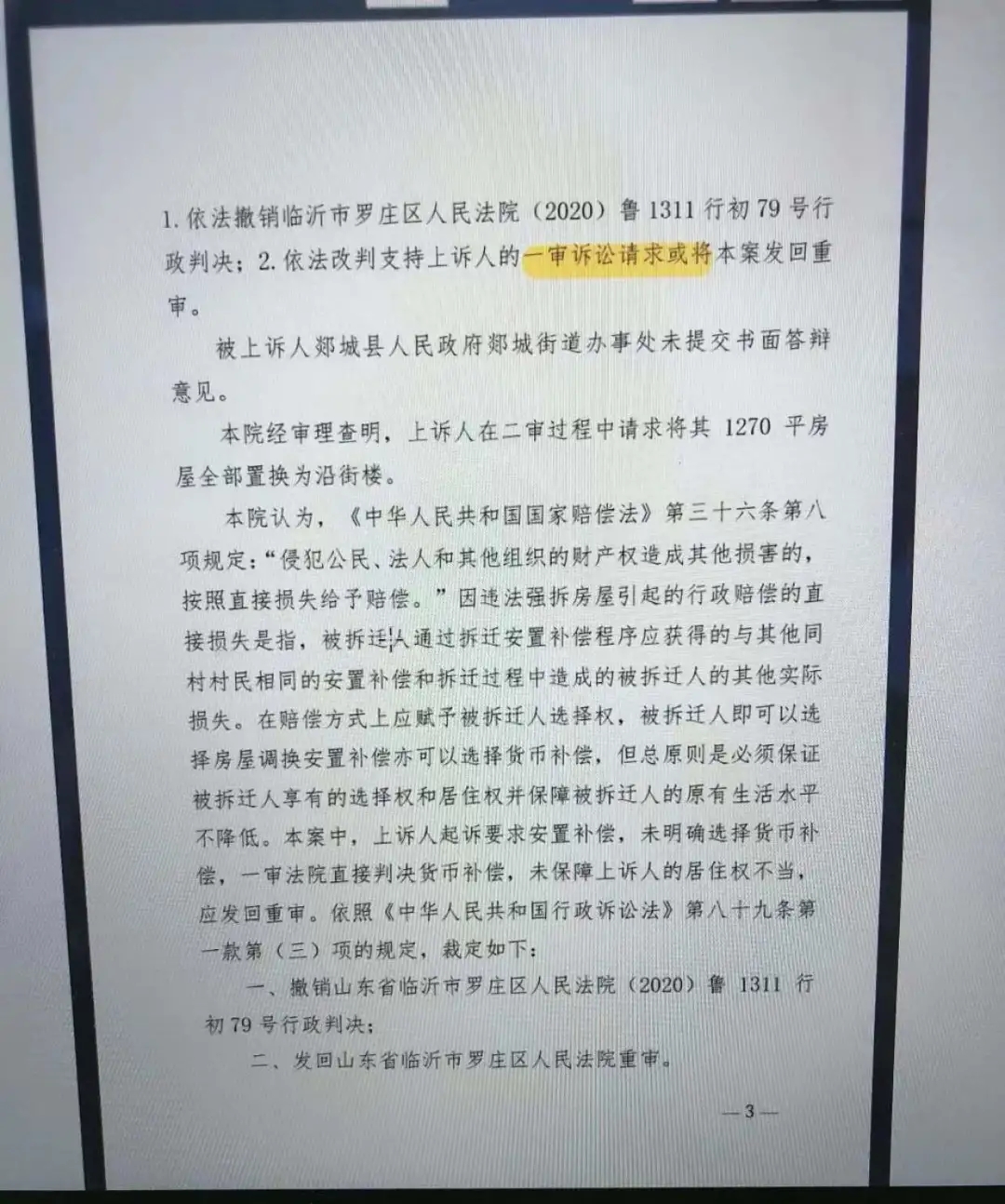 【胜诉公告】在行政赔偿方式上应赋予被拆迁人赔偿方式的选择权