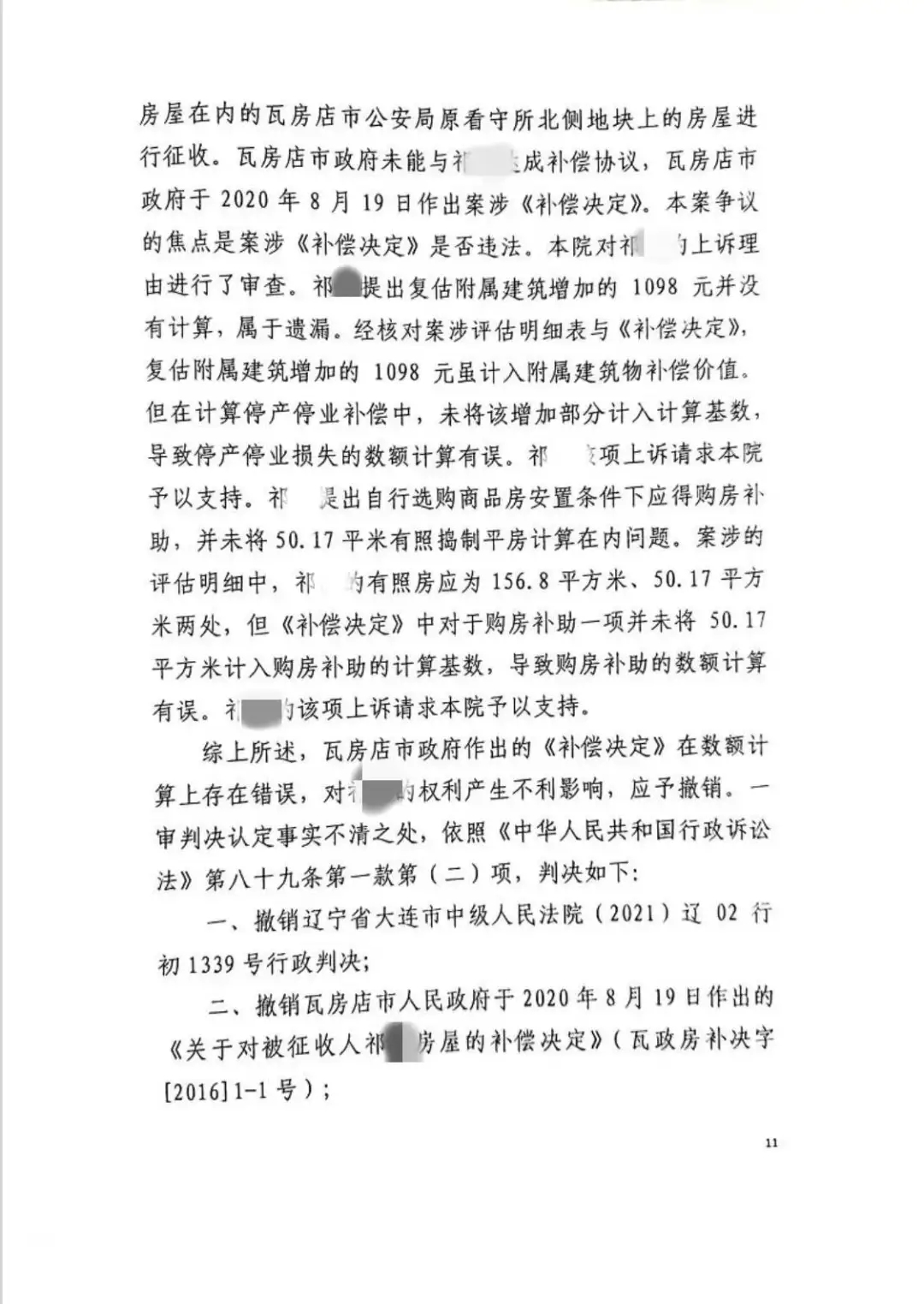 二、撤销瓦房店市人民政府于2020年8月19日作出的《关于对被征收人祁X房屋的补偿决定》(瓦政房补决字[2016]1-1号)。