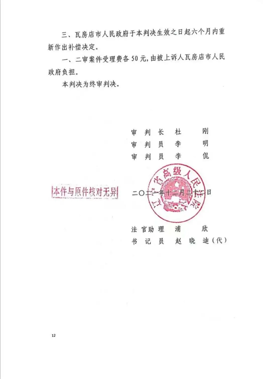 一、二审案件受理费各50元,由被上诉人瓦房店市人民政府负担。