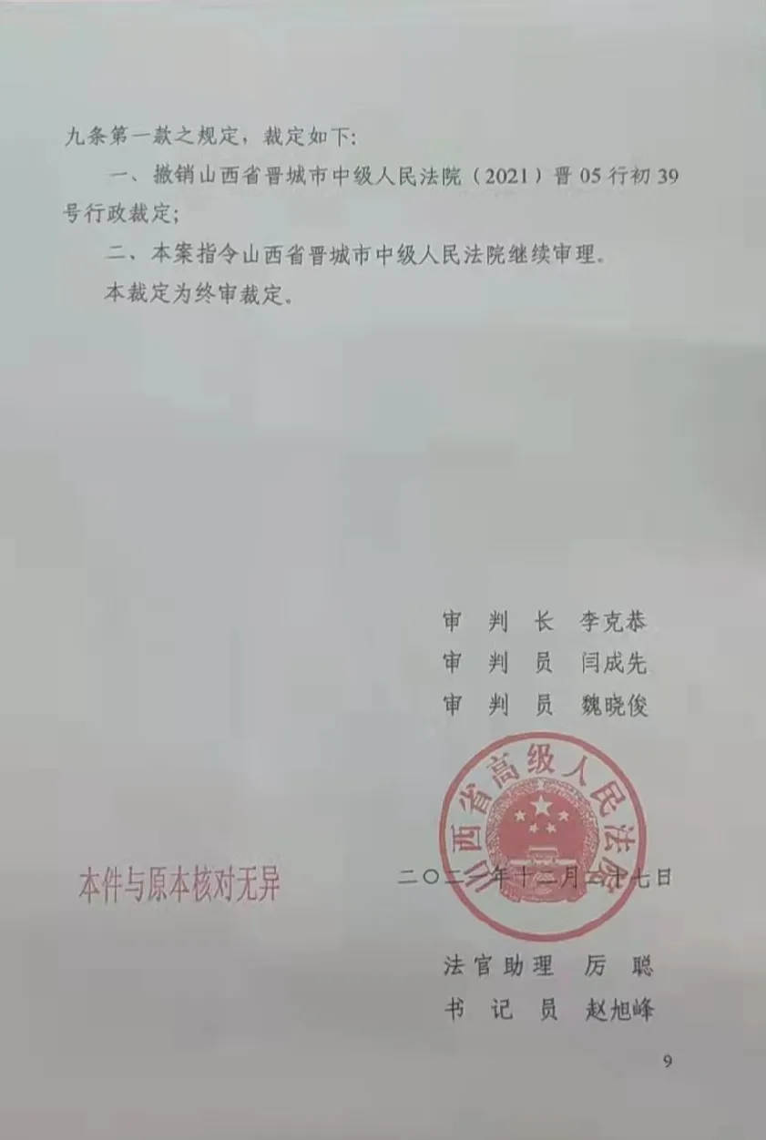 一、撤销山西省晋城市中级人民法院(2021)晋05行初39号行政裁定;