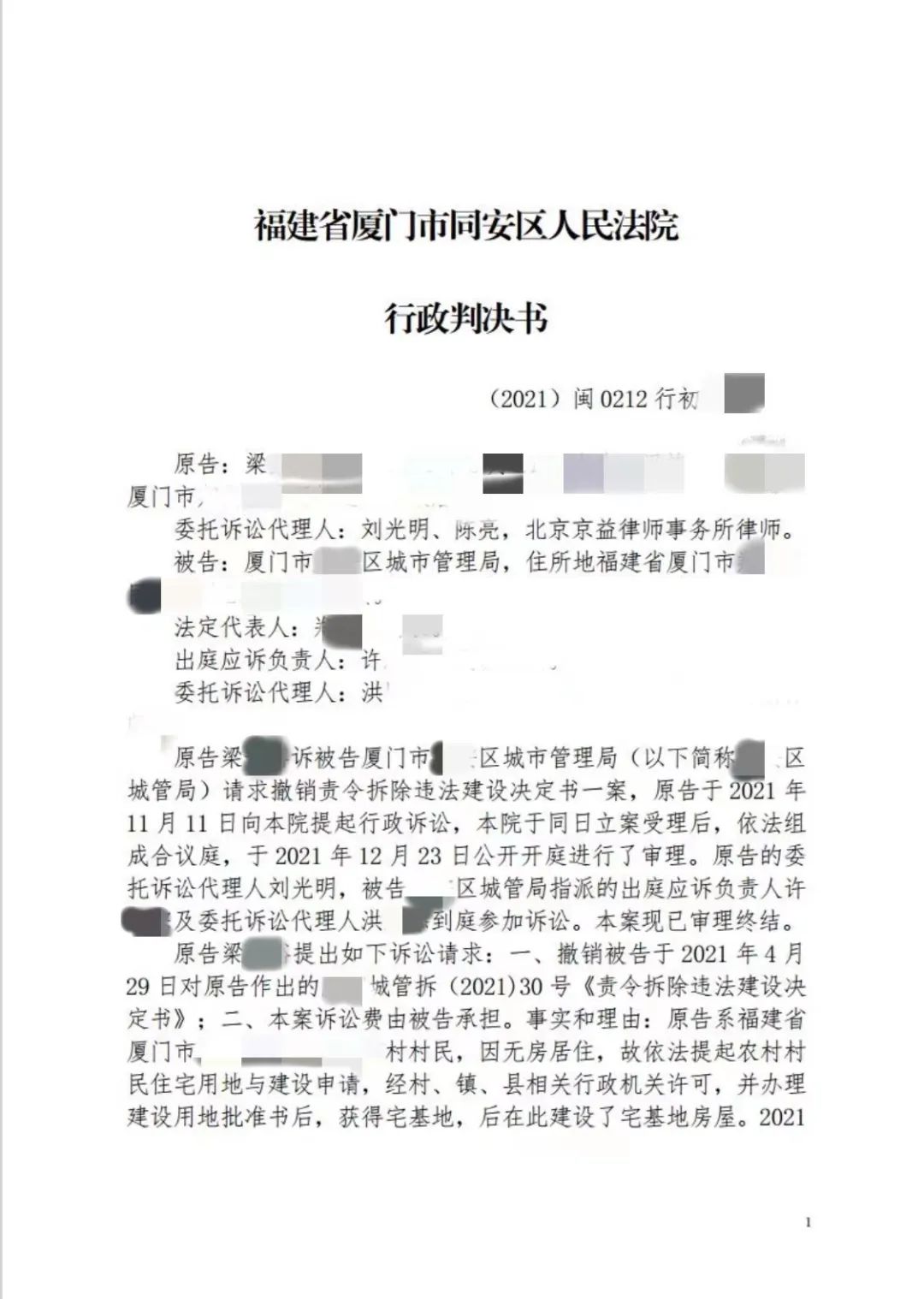 德凯律师团接受委托后,委派了刘光明和陈亮两位律师代理此案。两位律师及时搜集厦门市XX区城市管理局在作出《责令拆除违建决定书》过程中的诸多违法点,代理出庭,终获胜诉。