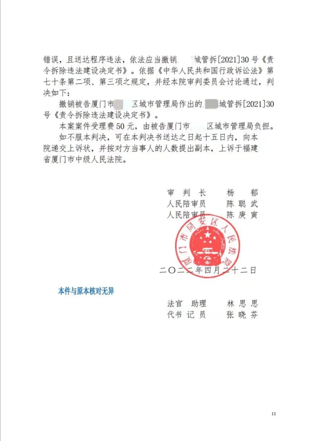 本案案件受理费50元,由被告厦门市XX区城市管理局负担。