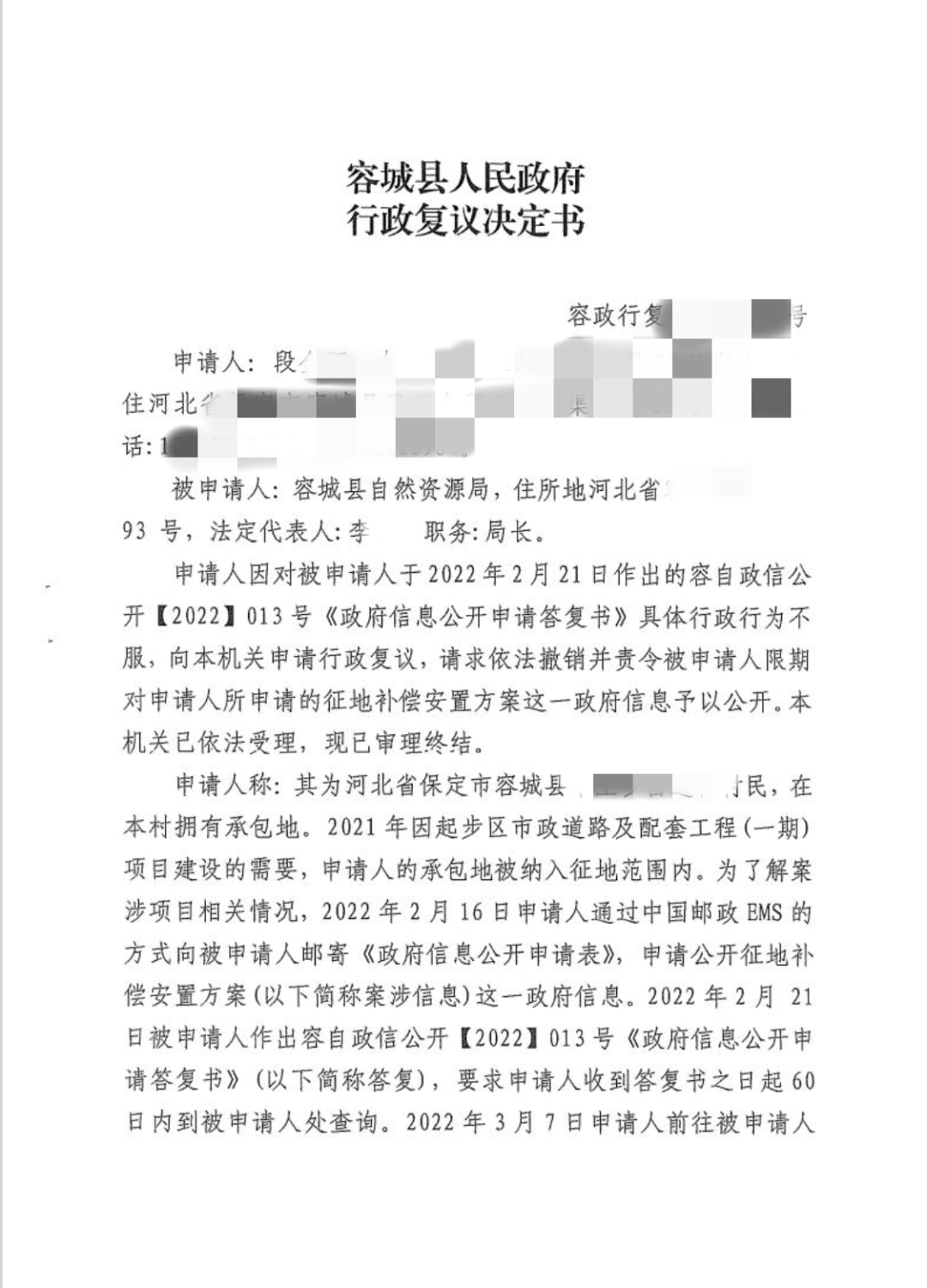 申请人为河北省保定市容城县某村村民,在本村拥有承包地。2021年因起步区市政道路及配套工程(一期)项目建设的需要,申请人的承包地被纳入征地范围内。