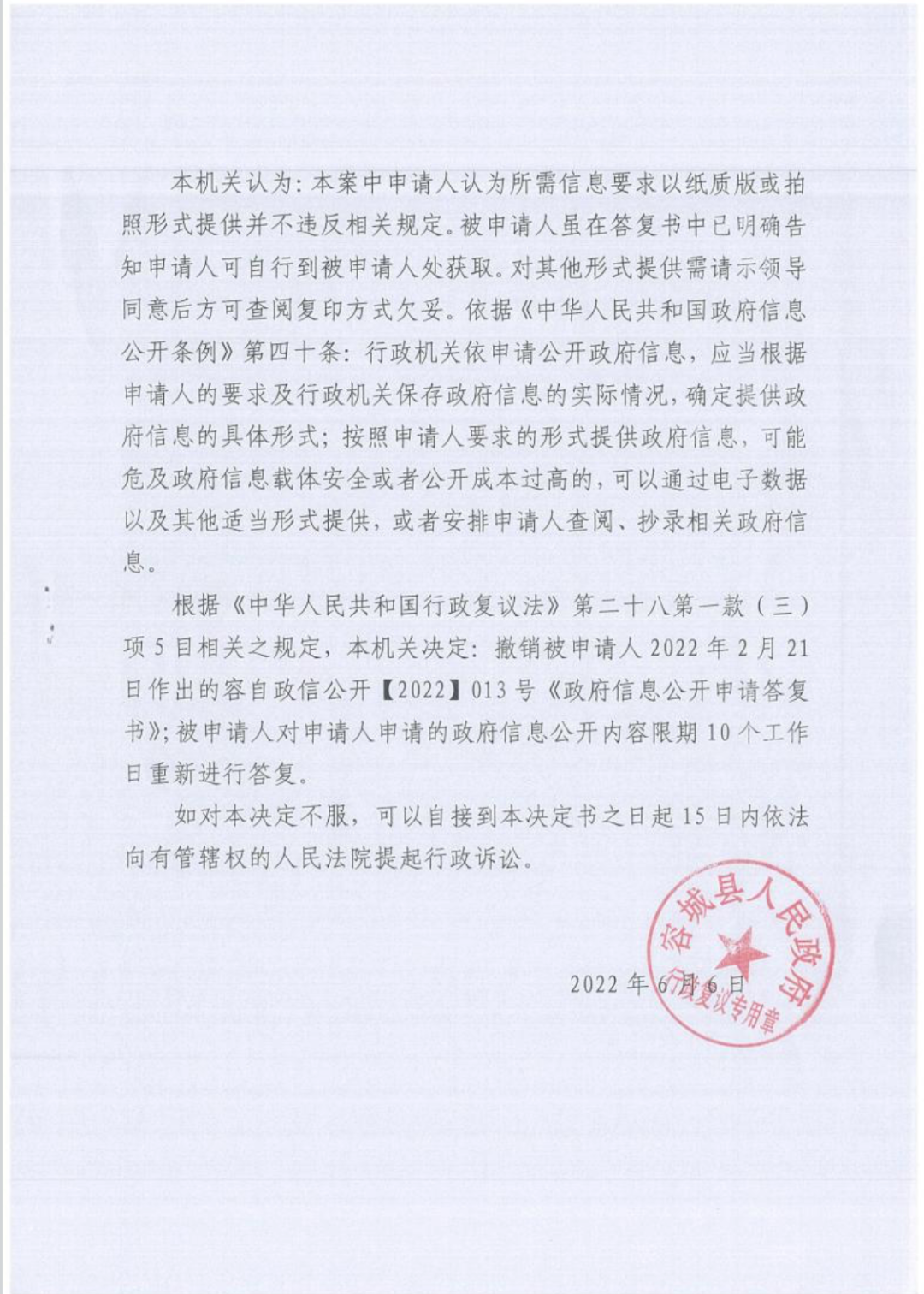 根据《中华人民共和国行政复议法》第二十八第一款(三)项5目相关之规定,本机关决定:撤销被申请人2022年2月21日作出的容自政信公开【2022】013 号《政府信息公开申请答复书》;被申请人对申请人申请的政府信息公开内容限期10个工作日重新进行答复。