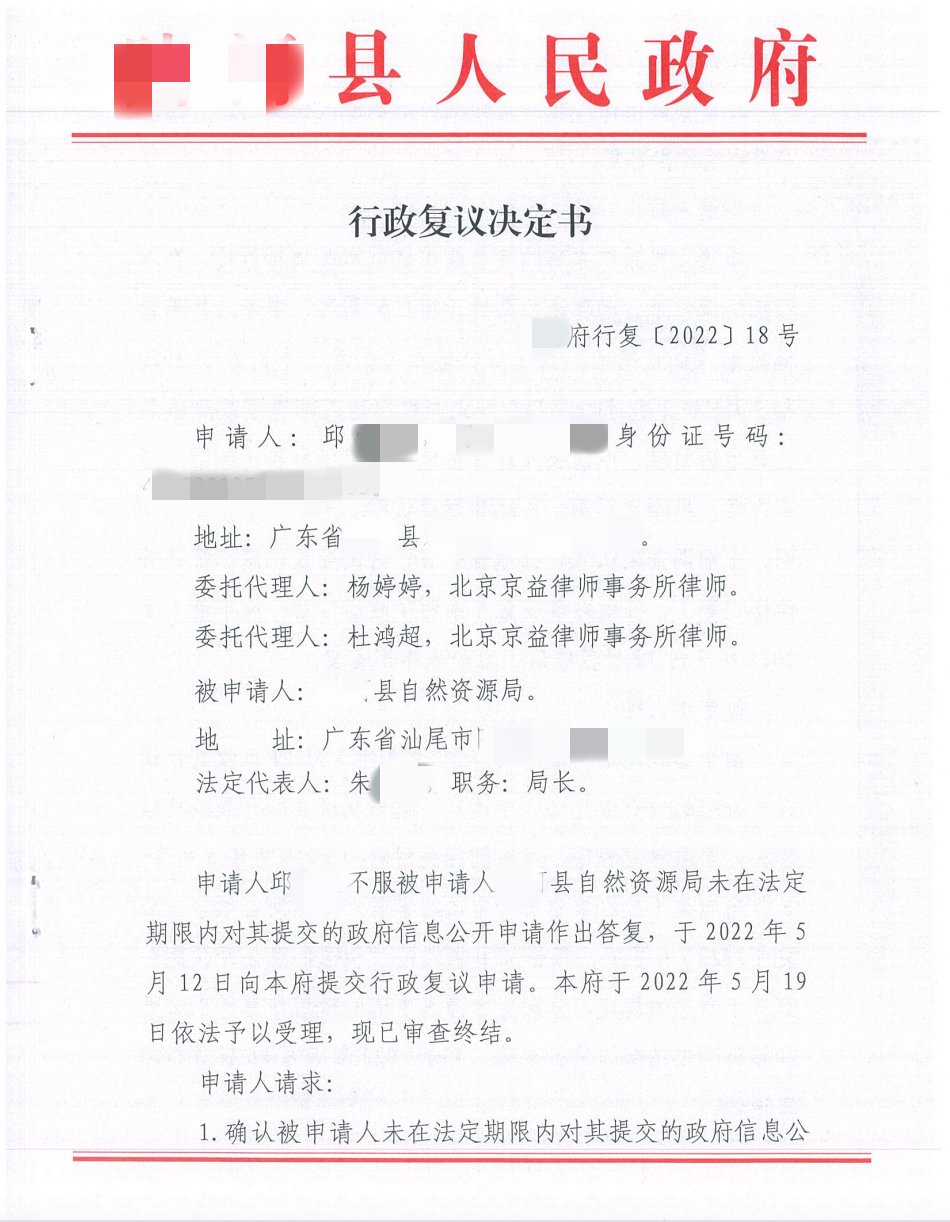 【胜诉公告】对政府信息公开申请不答复,行政复议保障知情权!